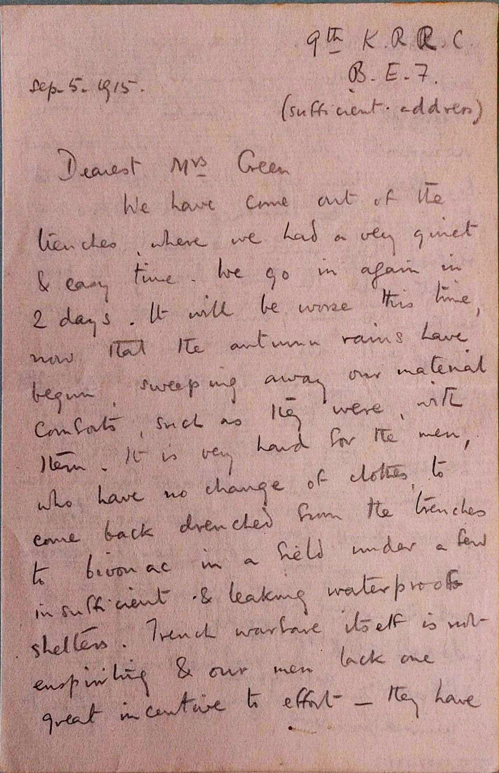 An important issue that Holloway raises in his letter to Green is that some of the enlisted men lacked the motivation and bond which would make them a stronger unit. He writes, ‘[t]rench warfare itself is not inspiring & our men lack one great incentive to effort – they have not been trained long enough to take pride in their regiment & not being recruited from one county, like many regiments, they have no pride of county to keep them up.’ A general lack of morale, as well as the absence of a common background among the soldiers created a regiment that, in Holloway’s opinion, lacked cohesion and pride. For these men to endure the awful conditions of the trenches and be successful in their campaigns, sufficient training was essential. It would provide the soldiers with a sense of pride for their battalion and connection to their fellow soldiers. For Holloway, it seems that this sense of bonding and pride was insufficient for the soldiers of the 9th K.R.R.C. The tone of Holloway’s letter generally lacks a sense of high morale, he notes that, ‘[i]t certainly requires a good deal of effort not to lose heart’, and also calls the war effort a ‘gigantic waste of energies.’