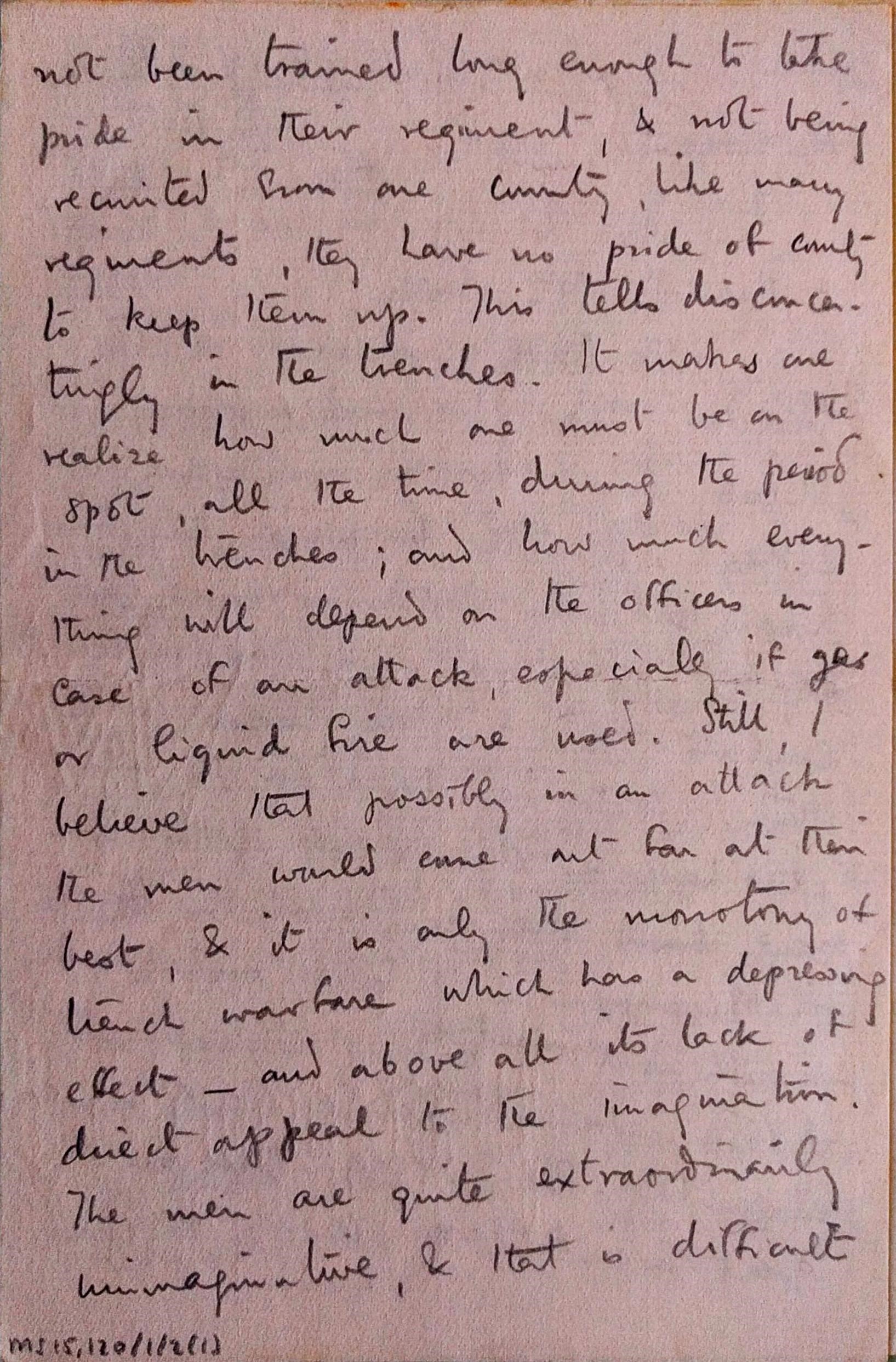 We have come out of the trenches where we had a very quiet & easy time. We go in again in 2 days. It will be worse this time, now that the autumn rains have begun, sweeping away our material comforts, such as it were, with them. It is very hard for the men, who have no change of clothes, to come back drenched from the trenches to [being?] in a field under a few insufficient & leaking waterproof shelters. Trench warfare itself is not inspiring & our men lack one great incentive to effort – they have not been trained long enough to take pride in their regiment & not being recruited from one county, like many regiments, they have no pride of county to keep them up. This tells distinctively in the trenches. It makes one realize how much one must be on the spot, all the time, during the period in the trenches; and how much everything will depend on the officers in case of an attack, especially if gas or liquid fire are used. Still I believe that possibly in an attack the men would [come out far as their best?], & it is only the monotony of trench warfare which has a depressing effect- and above all its lack of direct appeal to the imagination. The men are quite extraordinarily imaginative, & that is difficult to understand. What is not immediately before their nose does not exist for them, & we do not always realise that.