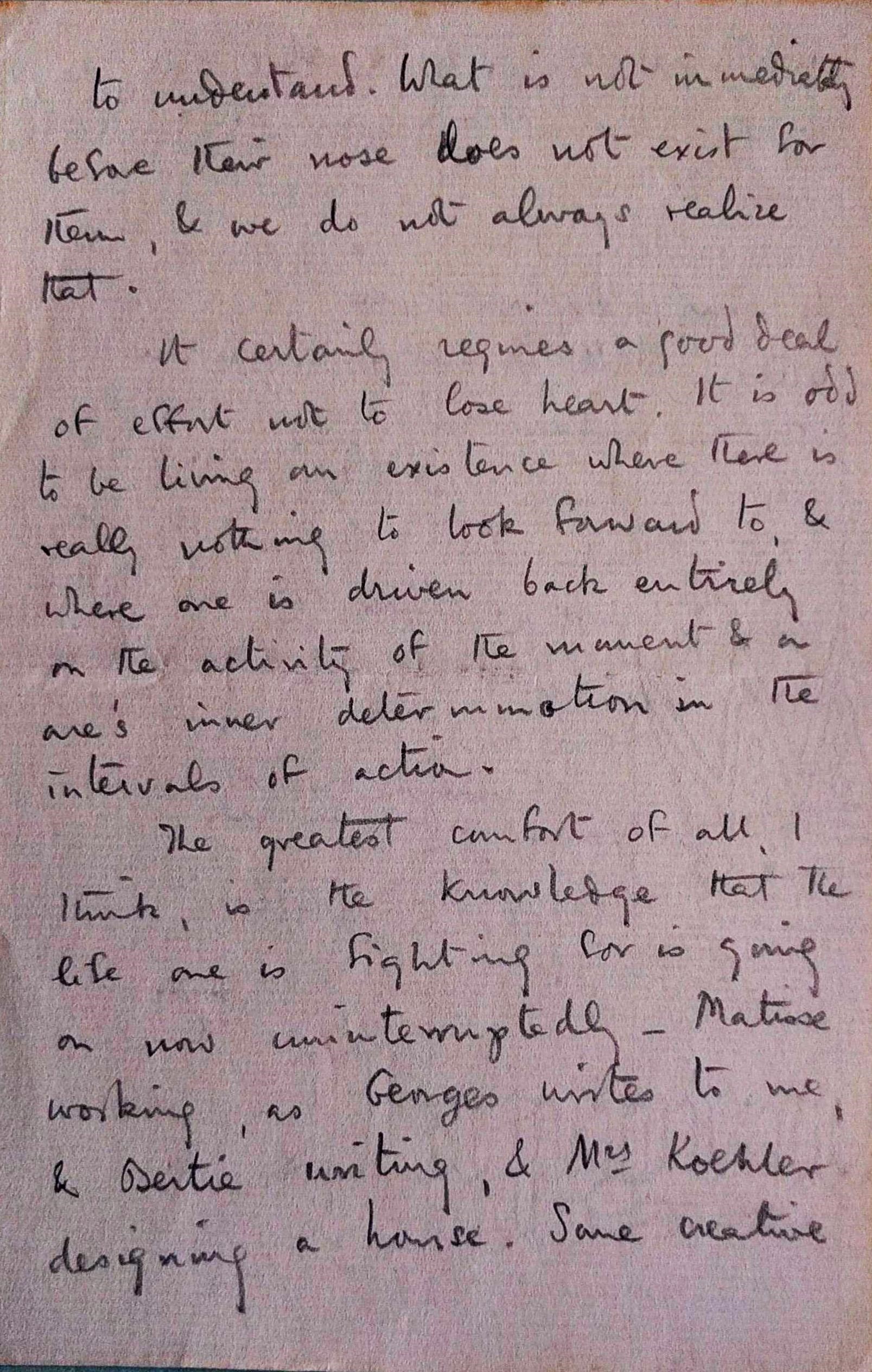 The greatest comfort of all, I think, is the knowledge that the life one is fighting for is going on now uninterruptedly- Matiose working, as George writes to me, and Bertie writing, & Mrs Koehler designing a house. Some creative work at any rate is still going on, by the side of this gigantic waste of energies.