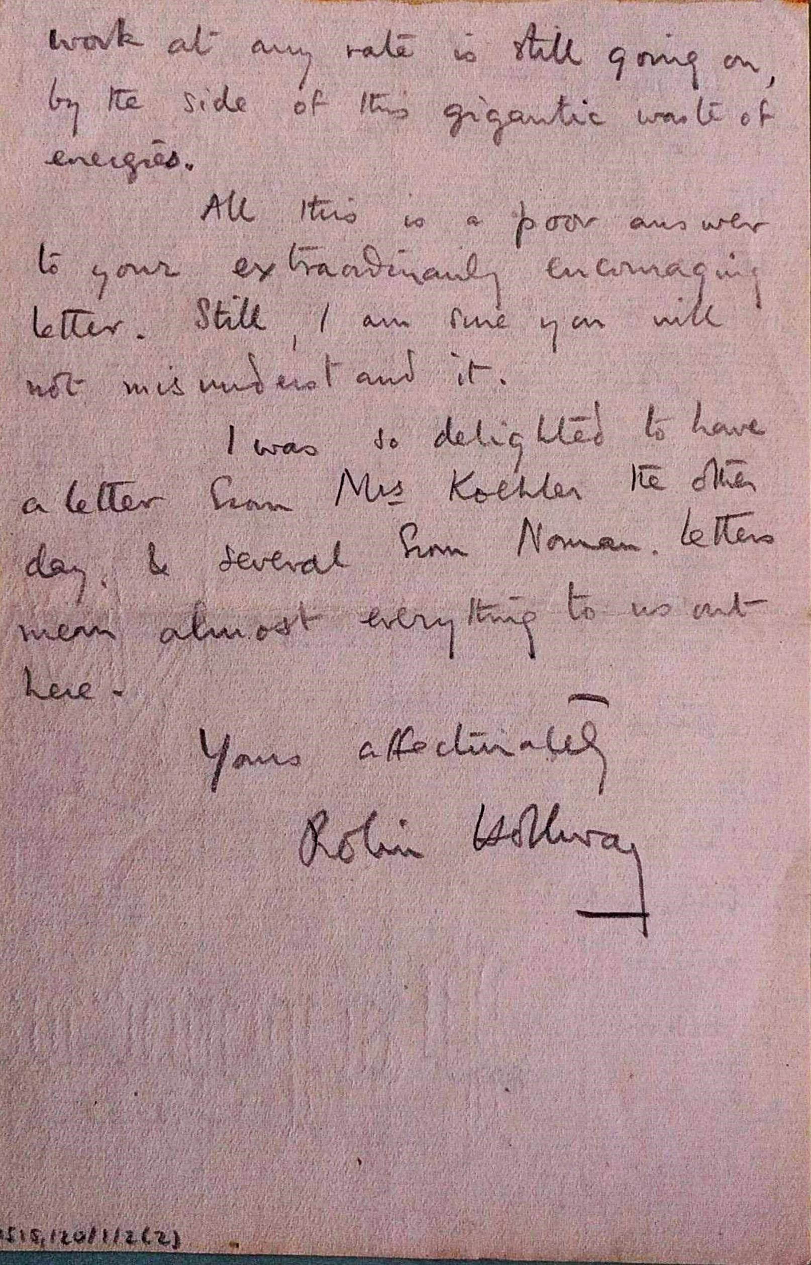 Letter from Robin Holloway to Alice Stopford Green Taken from ‘Twentyfive letters to Alice Stopford Green from the war front in France, 1915-1917, with copies of other letters on the war collected by her as material for lectures.’